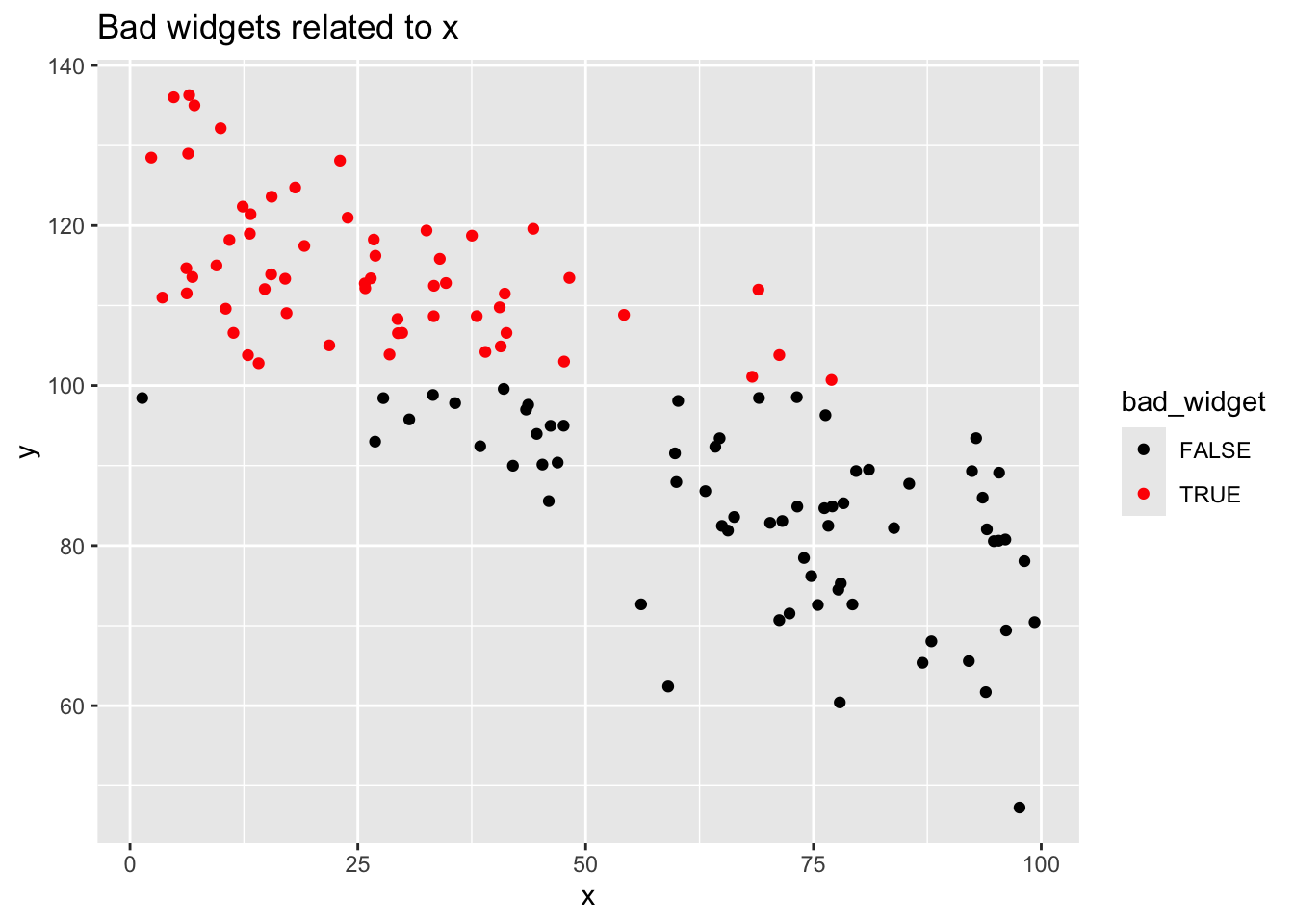 ggtitle("Bad widgets related to x")We reserve about 1/4 of cases for test set, and we’ll use the rest for training a predictive model. The plot shows the test set, since that is the data we’ll use to generate the ROC curves. If x is below about 20 all the points are red, and if it is above about 80 they are all black. In between is a region of varying uncertainty with more red at one end and more black at the other.