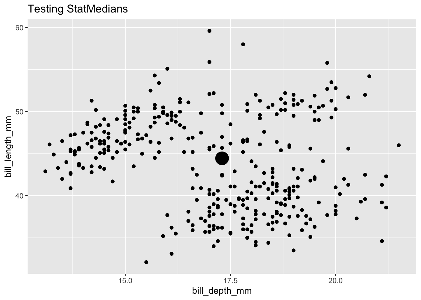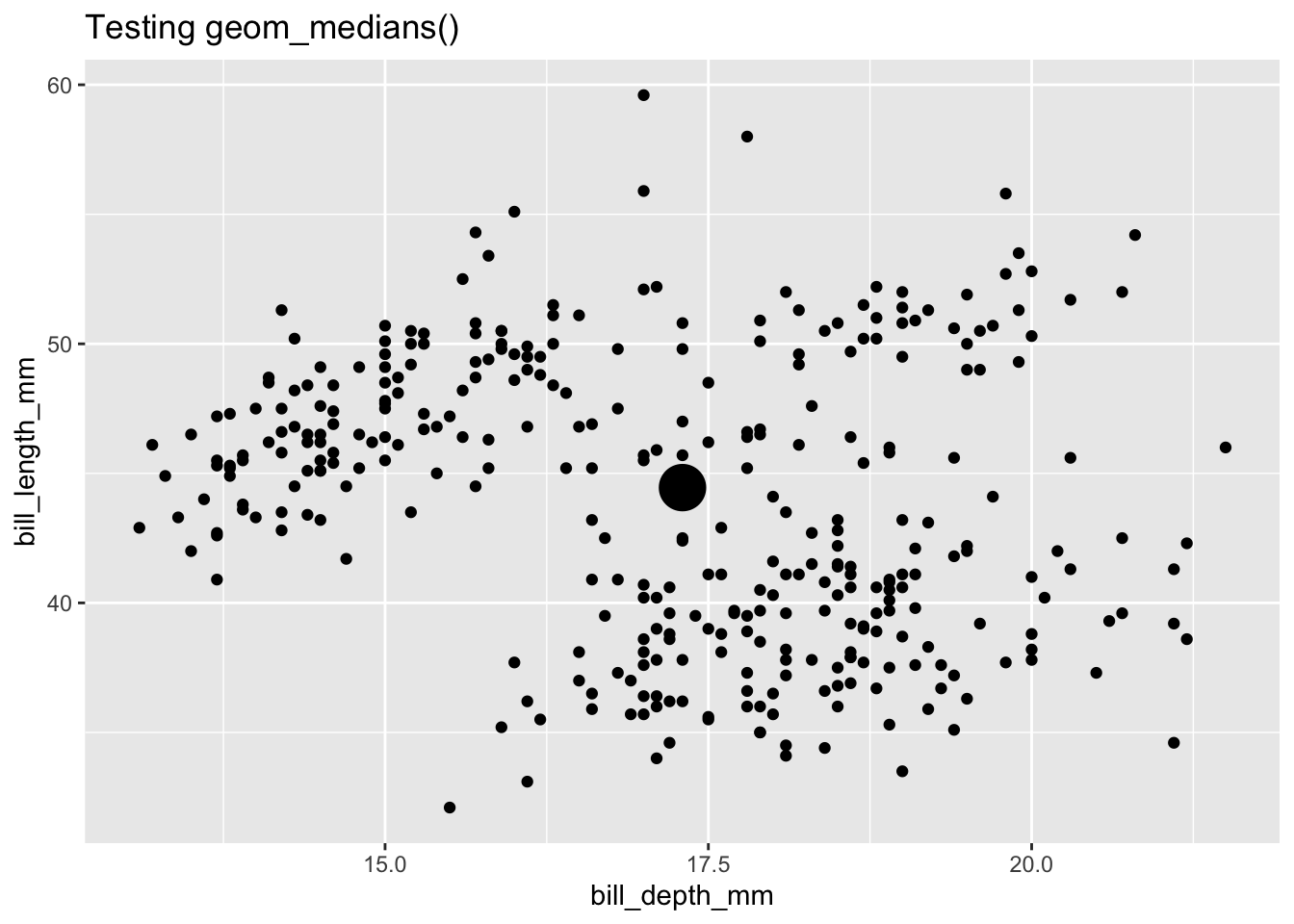 So, say we want to create a new geom_*() that adds a point on the median of the x-axis and y-axis variables of a plot. We will call it geom_medians(). Let’s follow the recipe: