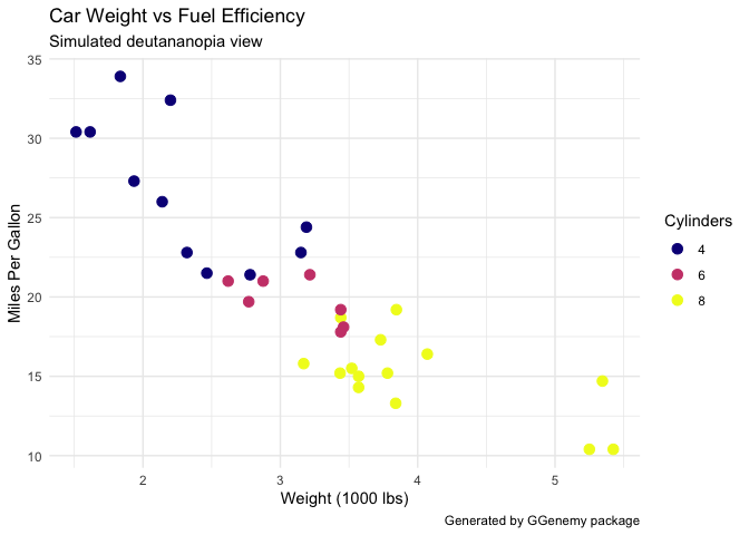 GGenemy v0.1.0: Audits ggplot2 visualizations for accessibility issues, misleading practices, and readability problems. Checks for color accessibility concerns, including colorblind-unfriendly palettes, misleading scale manipulations such as truncated axes and dual y-axes, text readability issues like small fonts and overlapping labels, and general accessibility barriers. Provides comprehensive audit reports with actionable suggestions for improvement. Color vision deficiency simulation uses methods from the colorspace package Zeileis et al. (2020) doi:10.18637/jss.v096.i01. Contrast calculations follow WCAG 2.1 guidelines (W3C 2018). See the vignette.