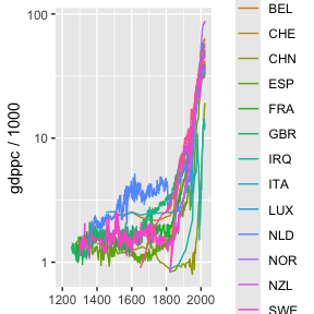 MaddisonData v1.0.2: Provides access to Maddison project data, which collates all the credible data on population and GDP for 169 countries. MaddisonLeaders makes it easy to find the leaders for each year, allowing users to exclude countries like OPEC with narrow economies to focus on the technology leaders. ggplotPath makes it easy to plot data for only selected countries or years. See the vignettes Industrial Revolution and Update Madison Data.
