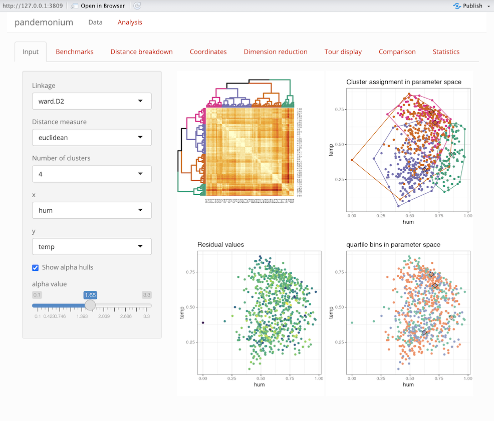 pandemonium v0.2.4: Implements a shiny GUI that performs high dimensional cluster analysis. This tool performs data preparation, clustering and visualisation within a dynamic GUI. With interactive methods allowing the user to change settings all without having to leave the GUI. See Laa and Valencia (2022) for background. There are seven vignettes, including Data Analysis and dimReduction.