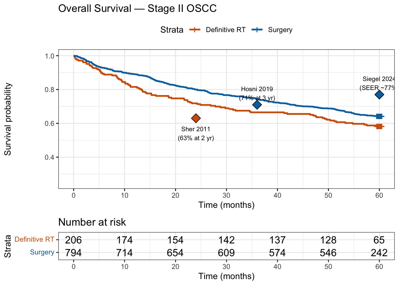 Siegel et al. (2024) “Cancer Statistics, 2024”, CA Cancer J Clin. 74(1):12–49. PMID: 38230766. DOI: 10.3322/caac.21820. Annual American Cancer Society SEER-based statistics report. Figure 5 reports 5-year relative survival for localized oral cavity cancer (SEER localised stage, encompassing Stage I–II) as approximately 84% (diagnoses 2013–2019, follow-up through 2020). Note: relative survival overstates absolute OS — adjusting for sex-weighted background mortality from the SSA 2021 Period Life Table at median age 62 (\(\\bar{S}^{(5)} = 0.920\)) yields an estimated absolute 5-yr OS of approximately 77% (\(0.84 \\times 0.920 = 0.773\)) for Stage II localised oral cavity. Used as the primary population-level calibration benchmark for the Surgery arm.