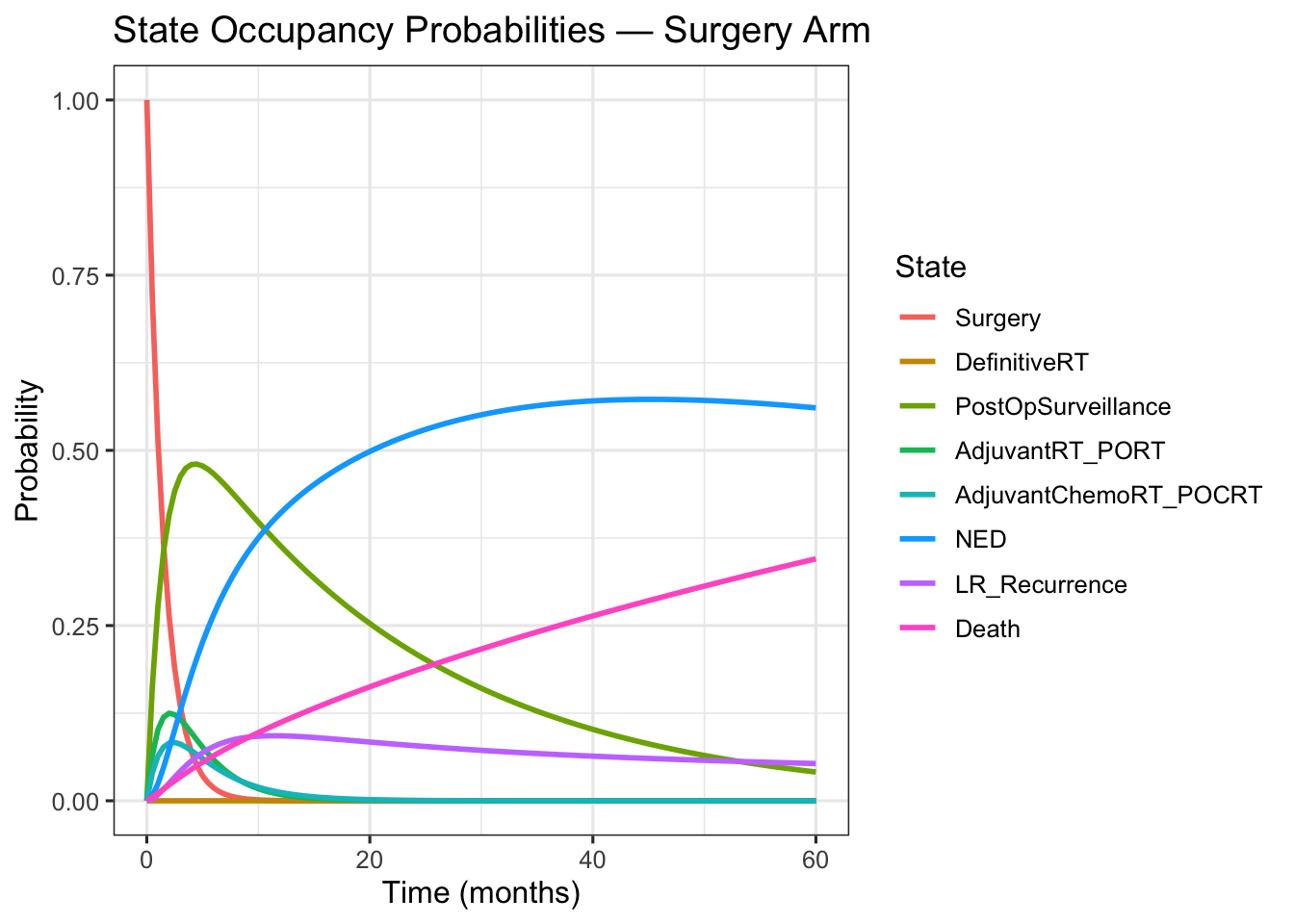 The recovery of patients undergoing treatment OSCC, either surgery or radiation treatment, is conceived as a stochastic journey through various health states. The states visited, the sequence in which they are visited and the length of stay in each health state are modeled as random variables developing in in the framework of an eight=state, continuous-time Markov chain. Estimates of the transition probabilities among states and the mean time patients would remain in a state drive Markov chain. In the model below, these estimates are derived from the medical literature, however, it is conceivable that clinicians may feel comfortable in making their own estimates, or modifying the literature derived estimates according to their experience and their evaluations of their patients.