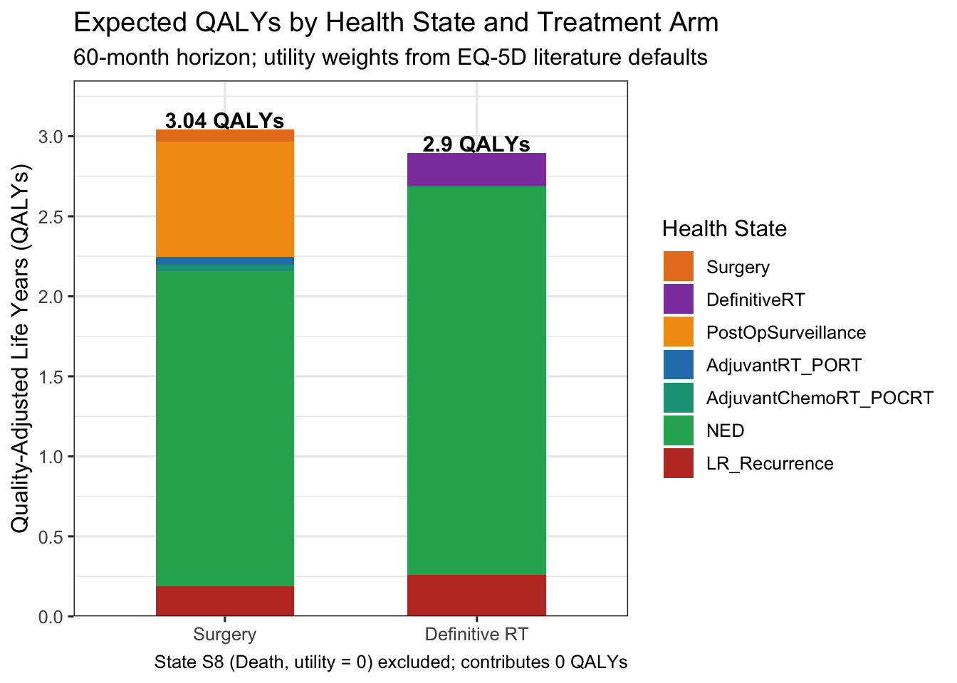 Truong et al. / RTOG 0522 (2017) “Quality of Life and Performance Status from a Substudy Conducted Within a Prospective Phase 3 Randomized Trial of Concurrent Accelerated Radiation Plus Cisplatin With or Without Cetuximab for Locally Advanced Head and Neck Carcinoma: NRG Oncology RTOG 0522”, Int J Radiat Oncol Biol Phys. 97(4):687–699. PMC5303682. PMID: 27727066. DOI: 10.1016/j.ijrobp.2016.08.003. Prospective phase III RCT, n = 818 analyzable patients (oropharynx, hypopharynx, larynx; Stage III–IV); EQ-5D-3L collected at pretreatment, last 2 weeks of treatment, 3 months, and annually. Reported EQ-5D values: baseline ~0.79 (CIS 0.78, CET/CIS 0.80); at 3 months from treatment start ~0.775 (CIS 0.78, CET/CIS 0.77); at 1 year ~0.84. Note: the EQ-5D value for the ‘within last 2 weeks of treatment’ time point was collected but not reported in the paper — the authors identified omission of an acute FACT-HN assessment as a study limitation. The 3-month value (0.775) is used as the closest available proxy for active-treatment utility in S5 (POCRT). Secondary limitation: cohort is definitively treated oropharynx/larynx (not postoperative oral cavity POCRT); adopted as best available CRT utility source. Comparison with Sprave et al. (2022): the Sprave 2022 adjuvant CRT cohort (baseline HI = 0.849, stable to RT completion; CRT vs RT-alone not significantly different at RT completion, p = 0.624) would support a value of ~0.83 for S5. The RTOG 0522-derived value of 0.775 is retained as a conservative estimate reflecting the higher toxicity of POCRT (high-dose cisplatin, post-surgical) relative to the mixed Sprave 2022 cohort. A sensitivity analysis using 0.83 would reduce the Surgery vs. Def RT QALY difference by ~0.009 QALYs. Primary source for S5 (POCRT) utility = 0.775. Not the primary source for S2 (RT alone); see Sprave et al. (2022).